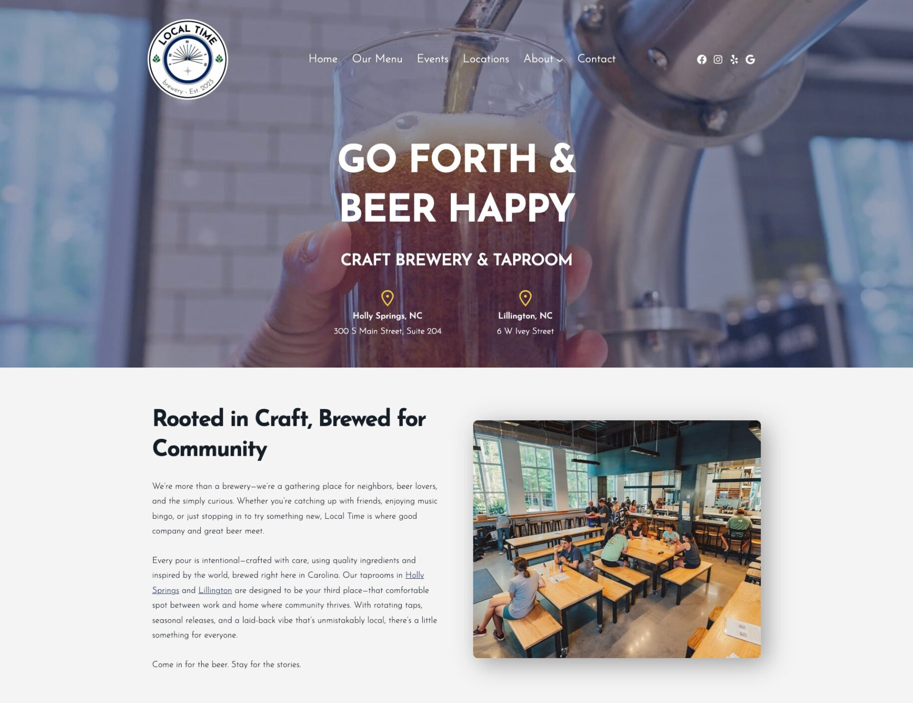 Rather than creating separate, fragmented experiences for each location, both taprooms are presented within a unified structure. The site consistently reinforces that Localtime Brewing operates in both Holly Springs and Lillington, while keeping navigation simple and intuitive. This approach reduces confusion and makes it easy for customers to understand where each beer is available.
